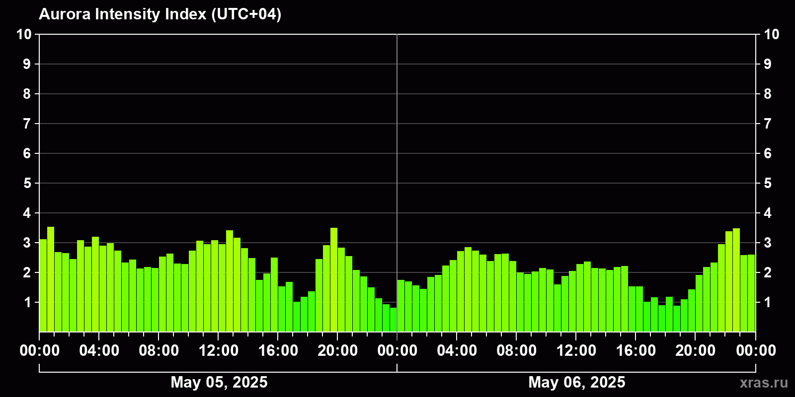 Auroral intensity index and the theoretically possible latitude of observations for nighttime in the Estern Hemisphere as of 2025-05-06 23:55 (end of day) local time