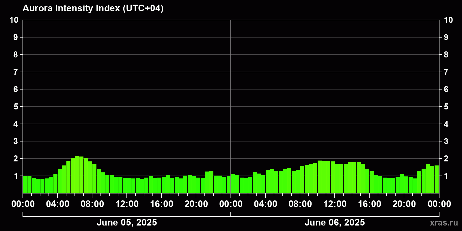 Auroral intensity index and the theoretically possible latitude of observations for nighttime in the Estern Hemisphere as of 2025-06-06 23:55 (end of day) local time