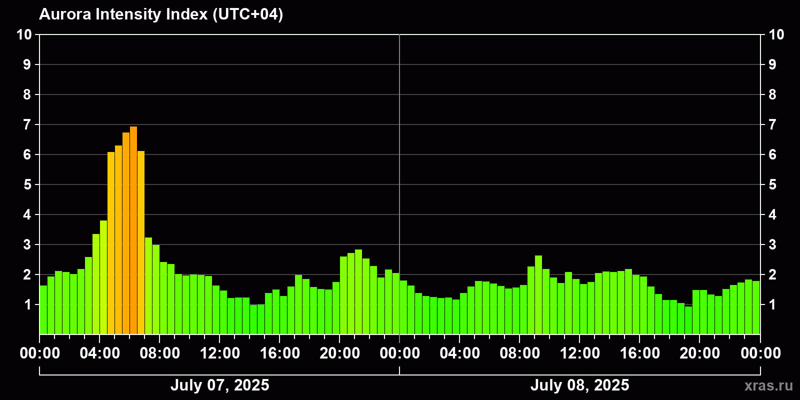 Changes in the auroral intensity index from 2025-07-07 to 2025-07-08 local time