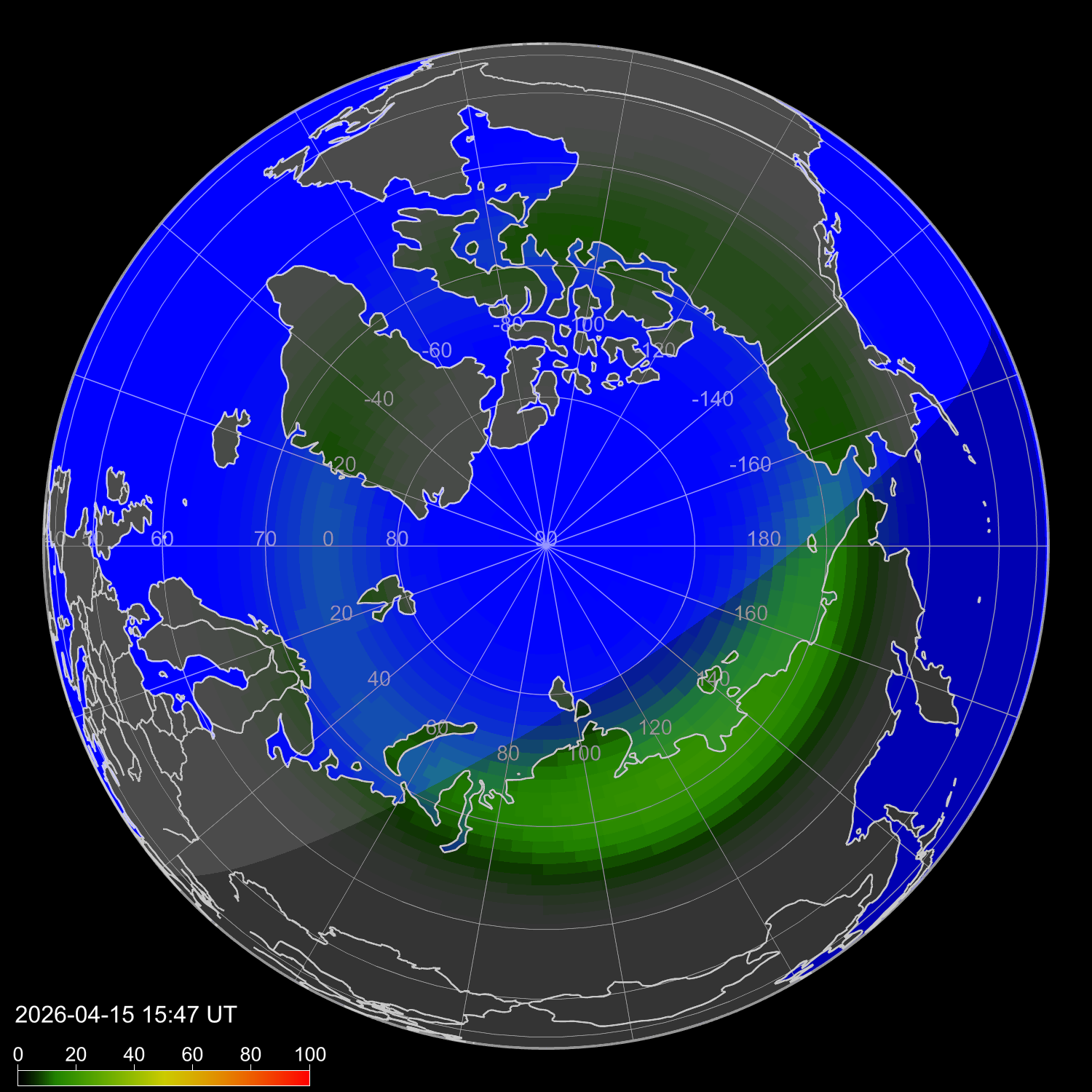 Auroral intensity index and theoretically possible latitude of observations for nighttime in the Western Hemisphere