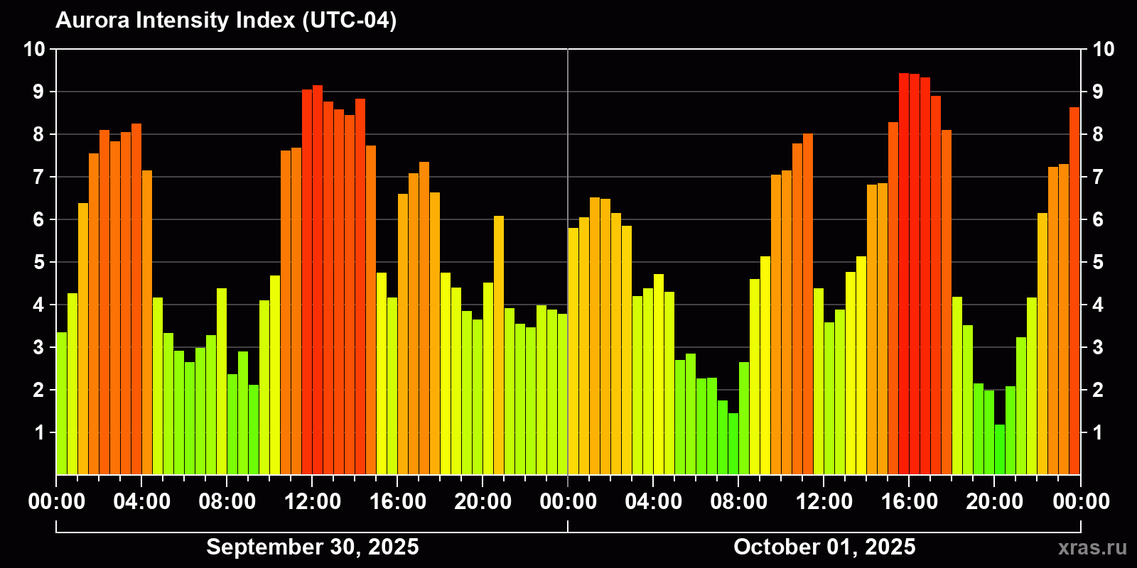 Auroral intensity index and the theoretically possible latitude of observations for nighttime in the Western Hemisphere as of 2025-10-01 23:49 (end of day) local time