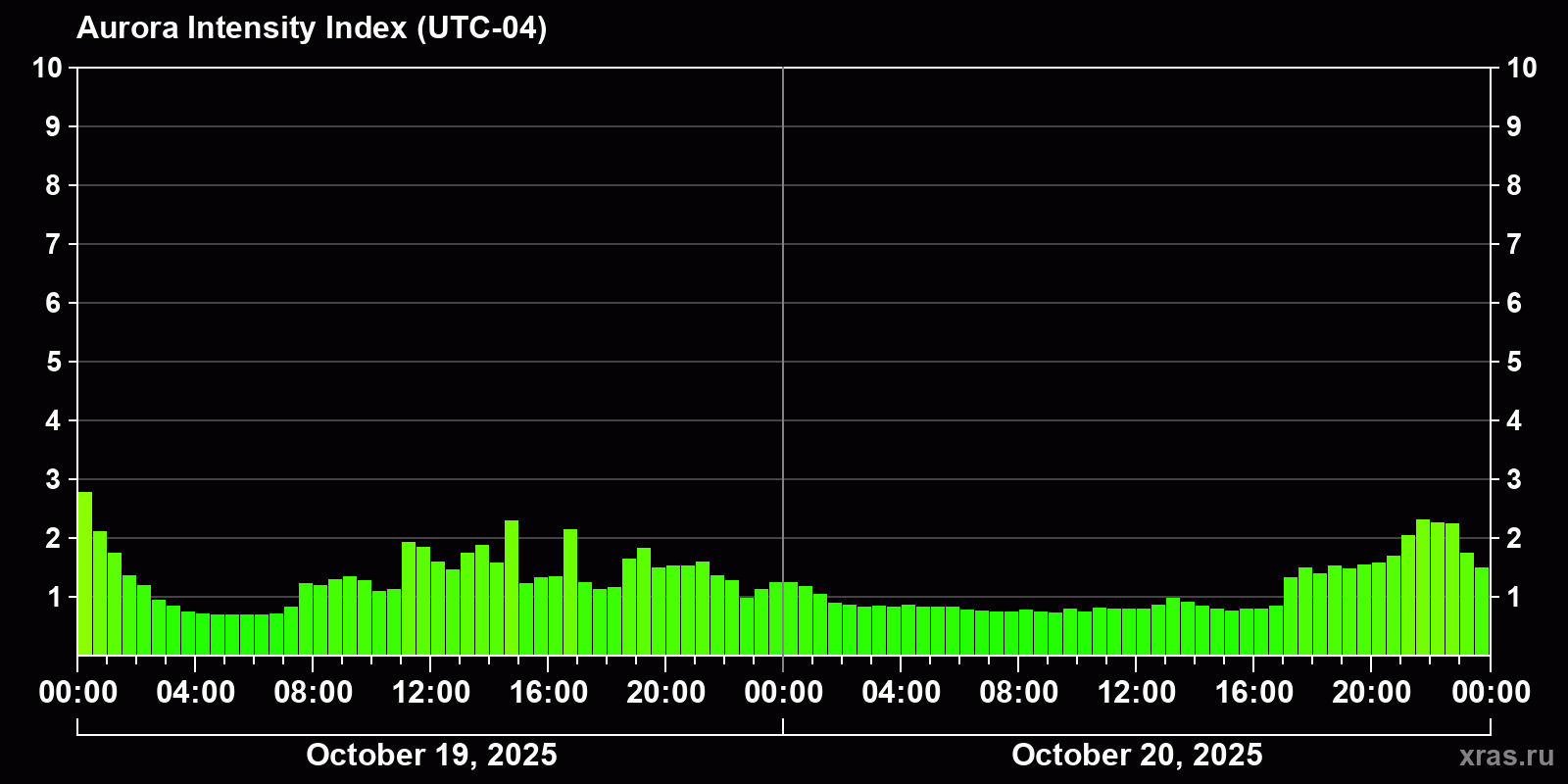 Auroral intensity index and the theoretically possible latitude of observations for nighttime in the Western Hemisphere as of 2025-10-20 23:50 (end of day) local time
