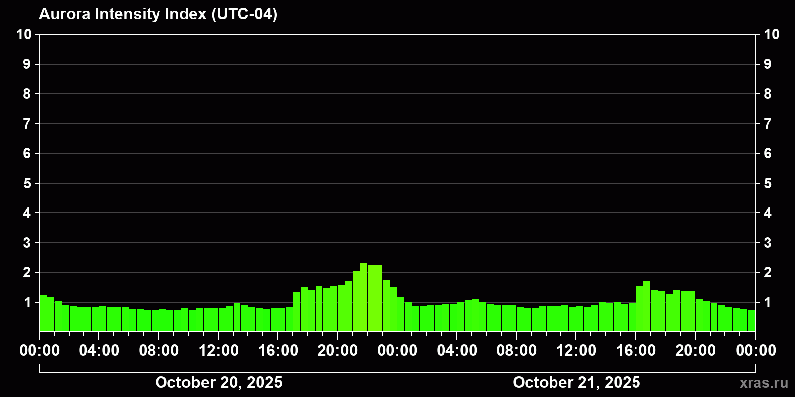 Auroral intensity index and the theoretically possible latitude of observations for nighttime in the Western Hemisphere as of 2025-10-21 23:48 (end of day) local time