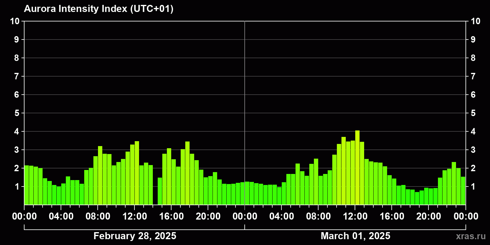 Auroral intensity index and the theoretically possible latitude of observations for nighttime in the Estern Hemisphere as of 2025-03-01 23:47 (end of day) local time