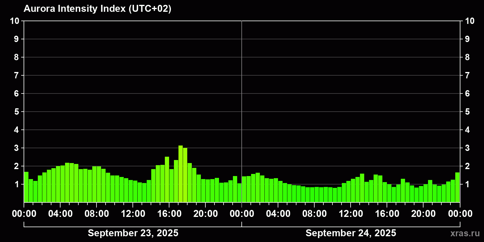 Auroral intensity index and the theoretically possible latitude of observations for nighttime in the Estern Hemisphere as of 2025-09-24 23:59 (end of day) local time