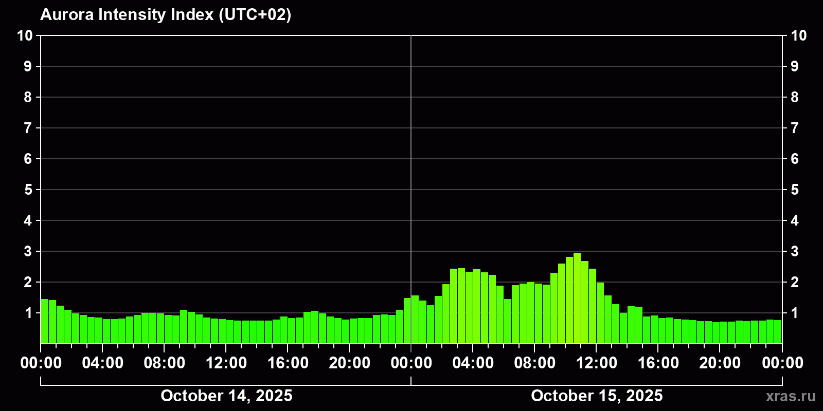 Auroral intensity index and the theoretically possible latitude of observations for nighttime in the Estern Hemisphere as of 2025-10-15 23:50 (end of day) local time