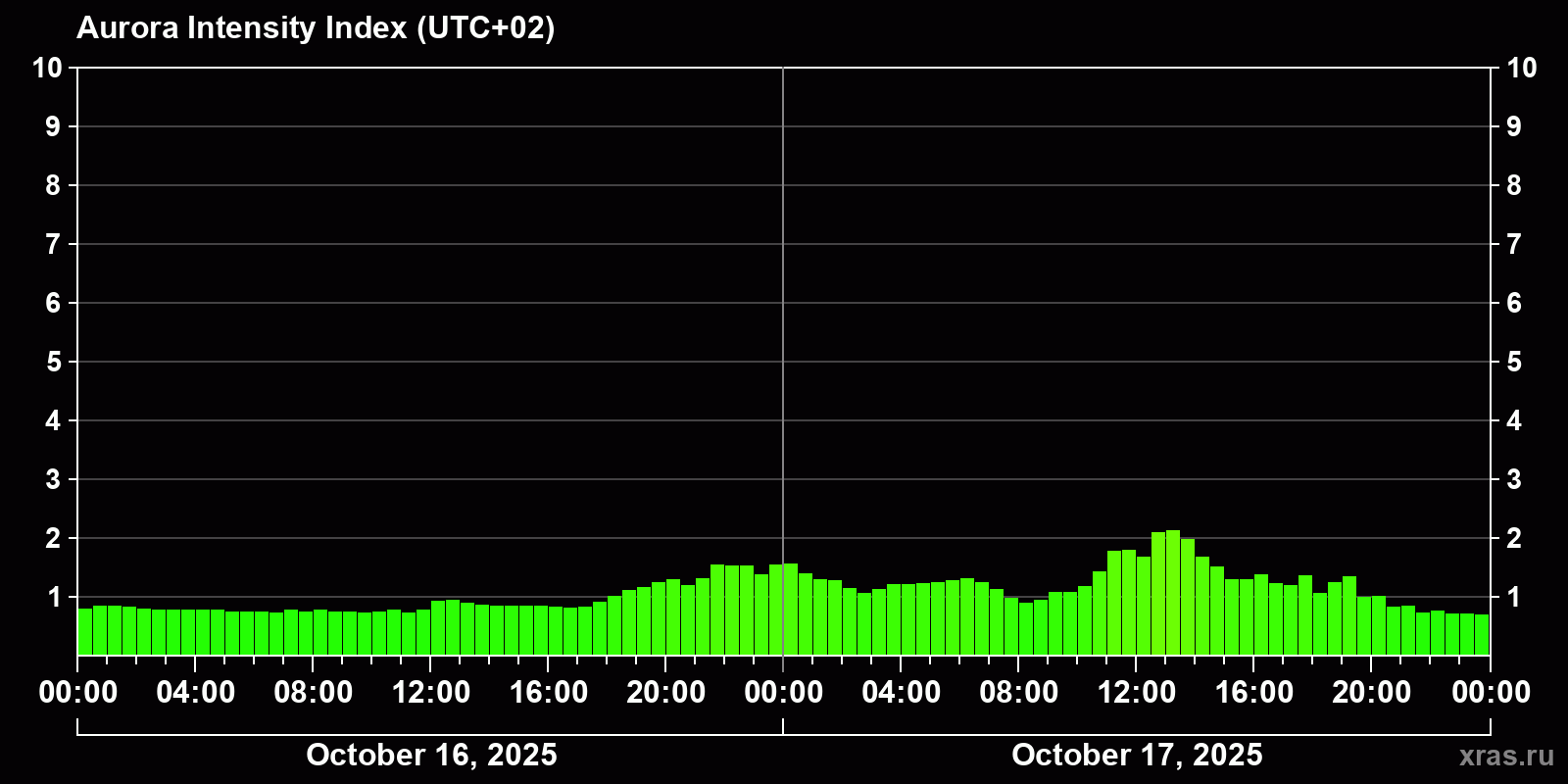 Changes in the auroral intensity index from 2025-10-16 to 2025-10-17 local time
