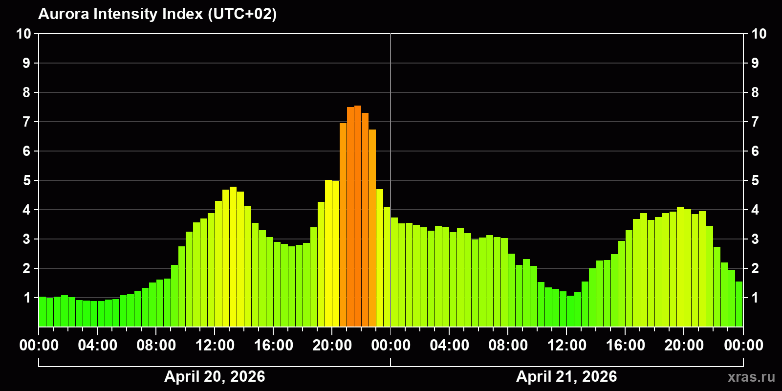 Changes in the auroral intensity index from 2026-04-20 to 2026-04-21 local time