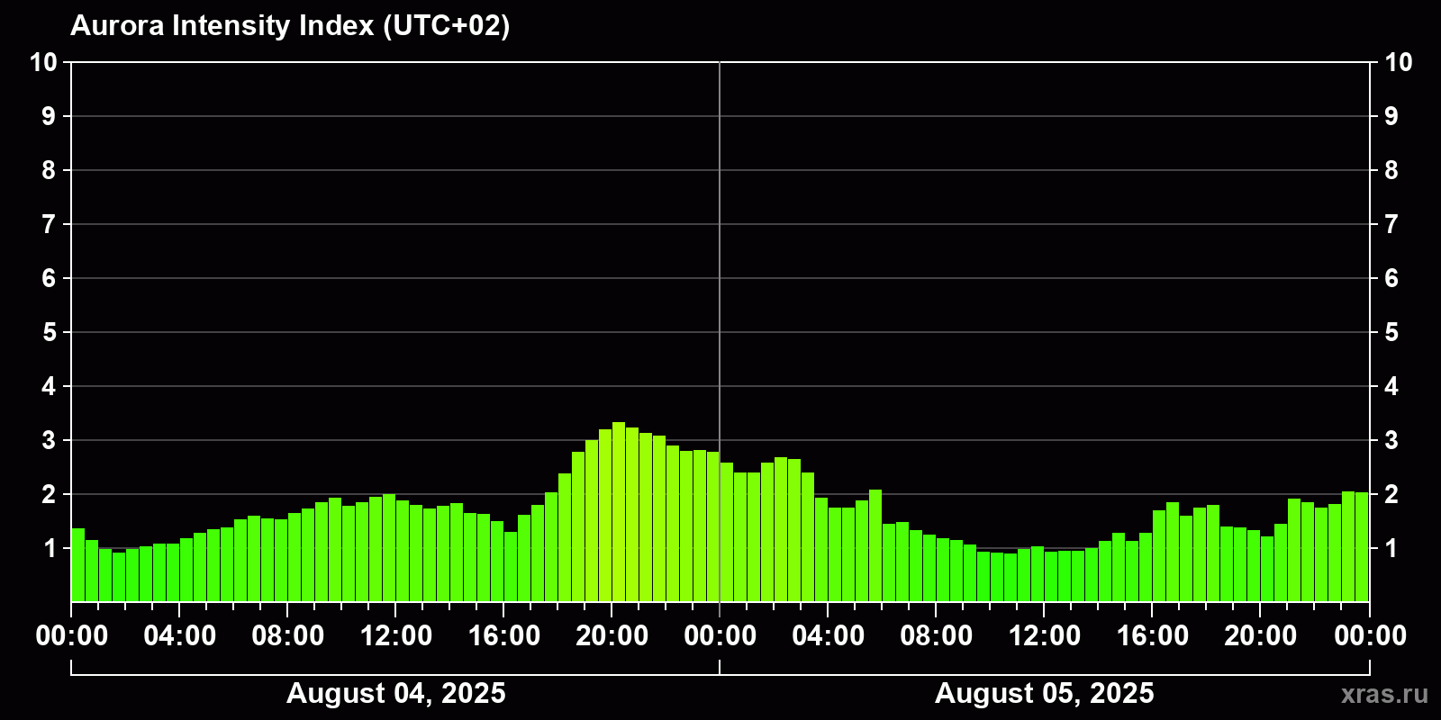 Changes in the auroral intensity index from 2025-08-04 to 2025-08-05 local time