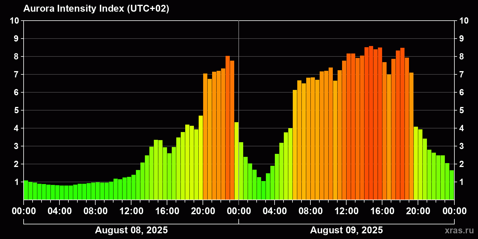 Auroral intensity index and the theoretically possible latitude of observations for nighttime in the Estern Hemisphere as of 2025-08-09 23:58 (end of day) local time