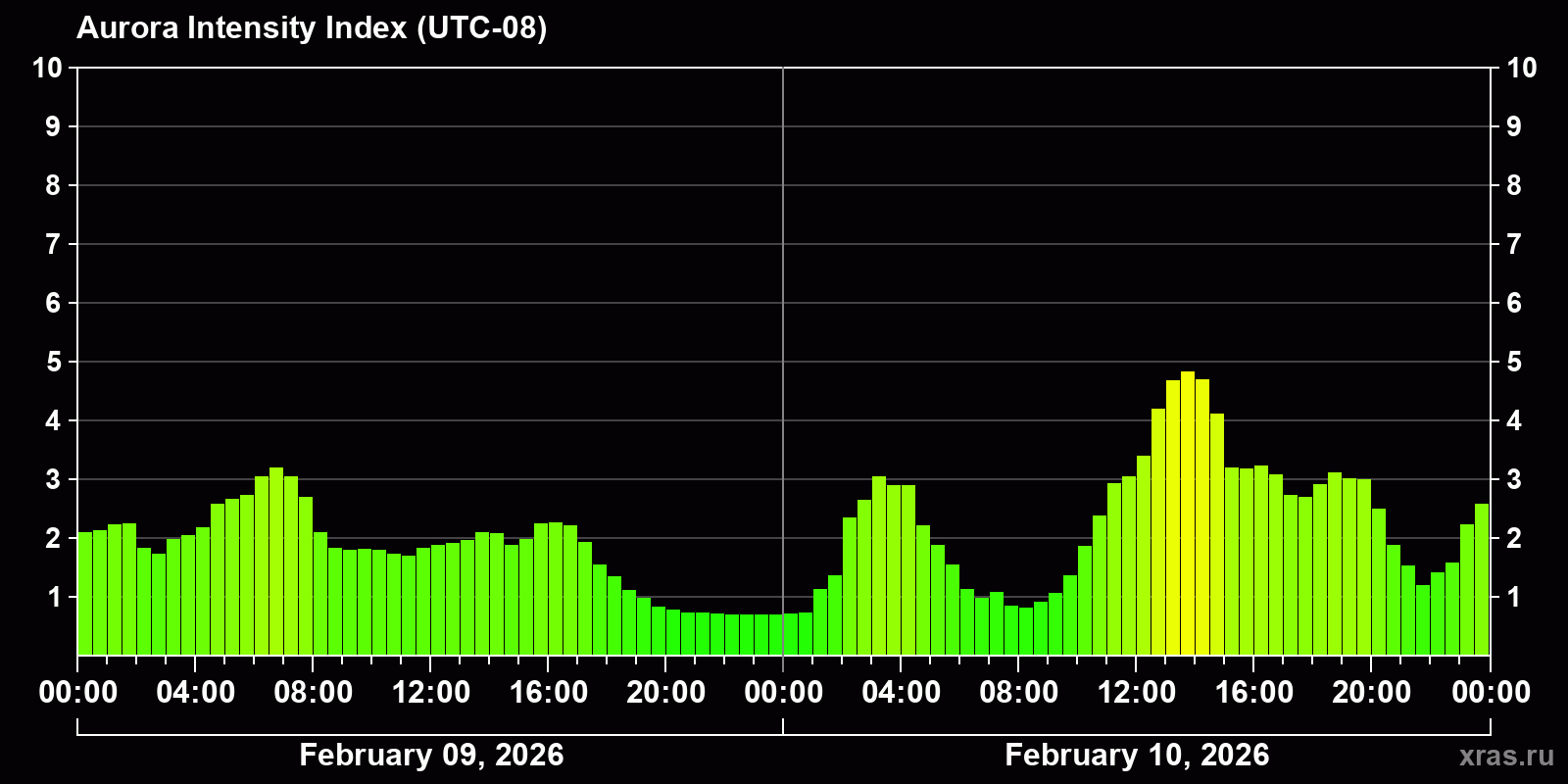 Auroral intensity index and the theoretically possible latitude of observations for nighttime in the Western Hemisphere as of 2026-02-10 23:57 (end of day) local time
