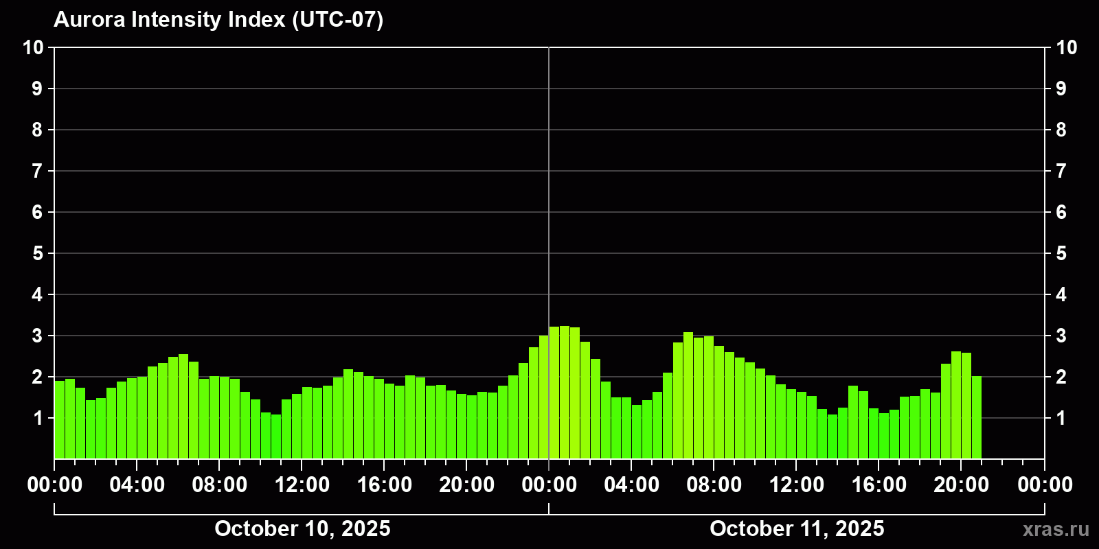Auroral intensity index and the theoretically possible latitude of observations for nighttime in the Western Hemisphere as of 2025-10-11 18:47 (end of day) local time