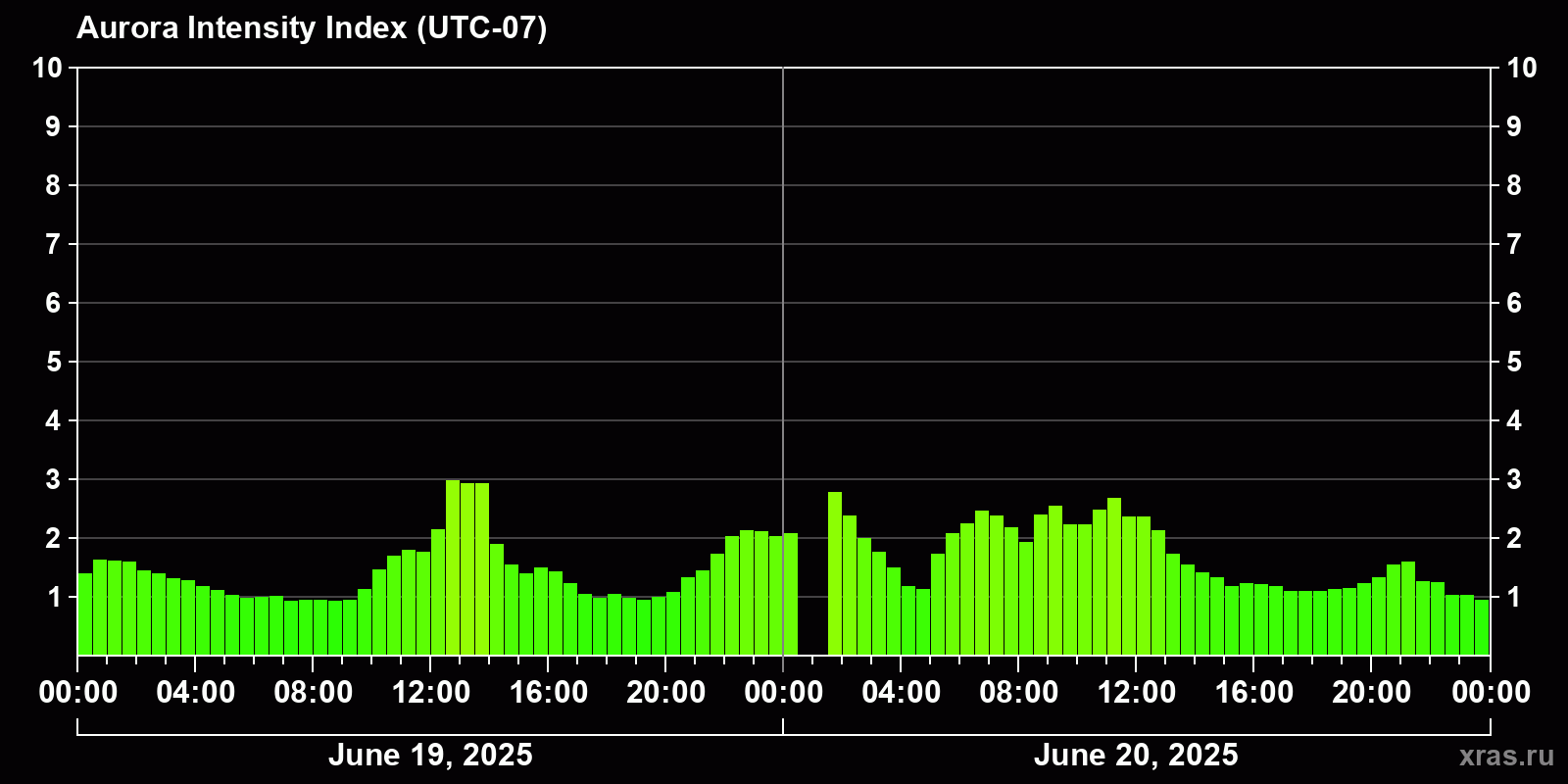 Auroral intensity index and the theoretically possible latitude of observations for nighttime in the Western Hemisphere as of 2025-06-20 23:51 (end of day) local time