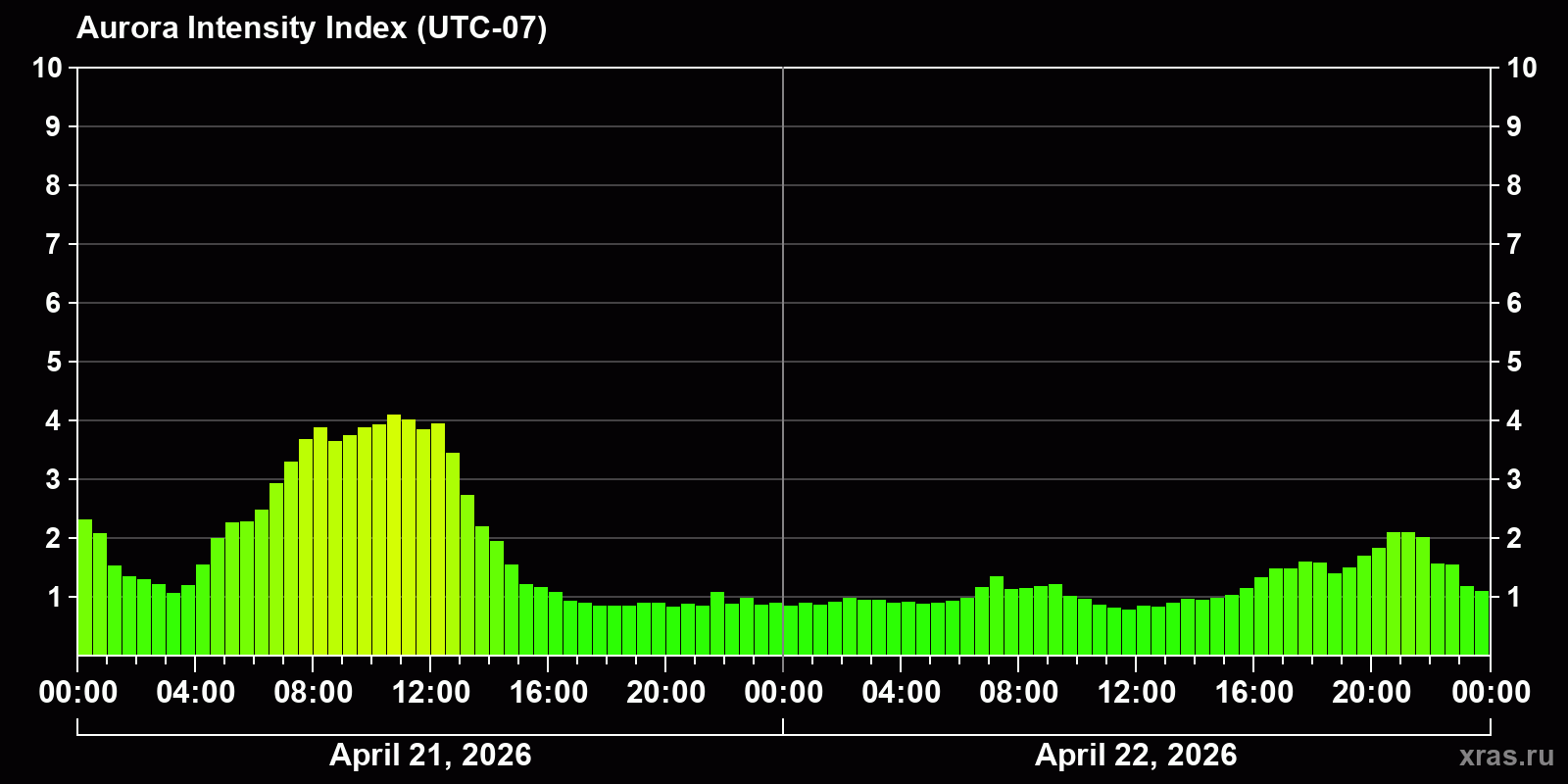 Auroral intensity index and the theoretically possible latitude of observations for nighttime in the Western Hemisphere as of 2026-04-22 23:53 (end of day) local time