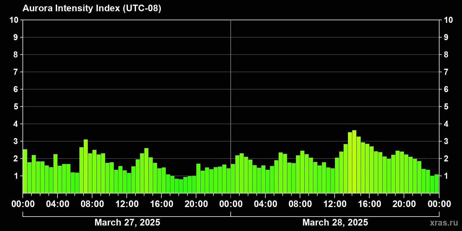 Changes in the auroral intensity index from 2025-03-27 to 2025-03-28 local time