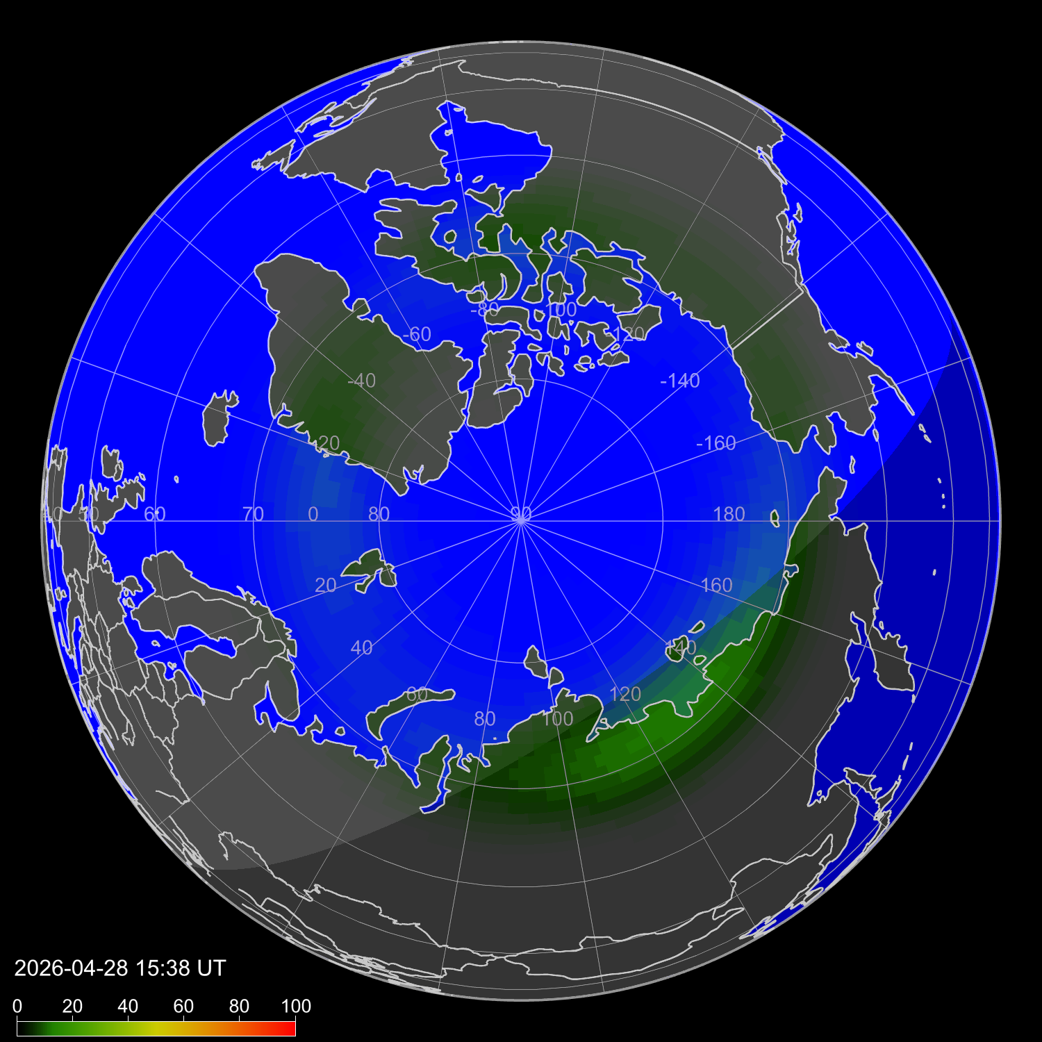 Changes and hourly forecast of the auroral intensity index from 2026-04-27 to 2026-04-28