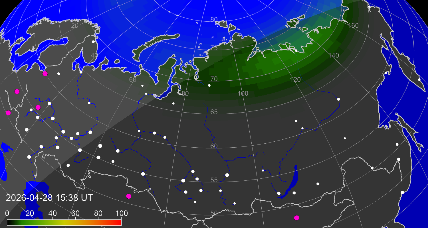 Auroral intensity index and theoretically possible latitude of observations for nighttime in the Estern Hemisphere