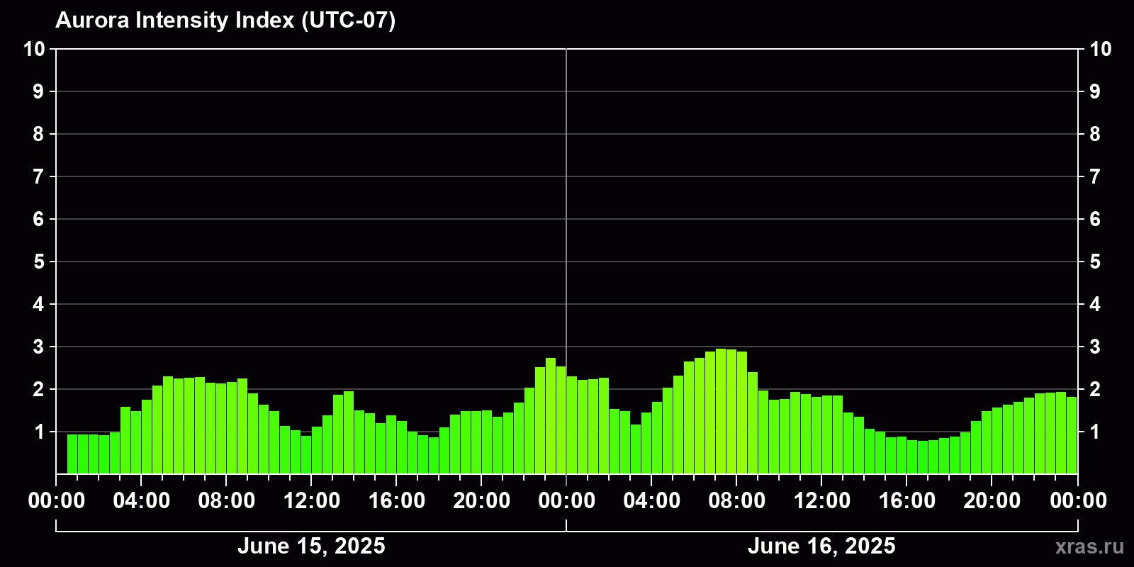 Auroral intensity index and the theoretically possible latitude of observations for nighttime in the Western Hemisphere as of 2025-06-16 23:58 (end of day) local time