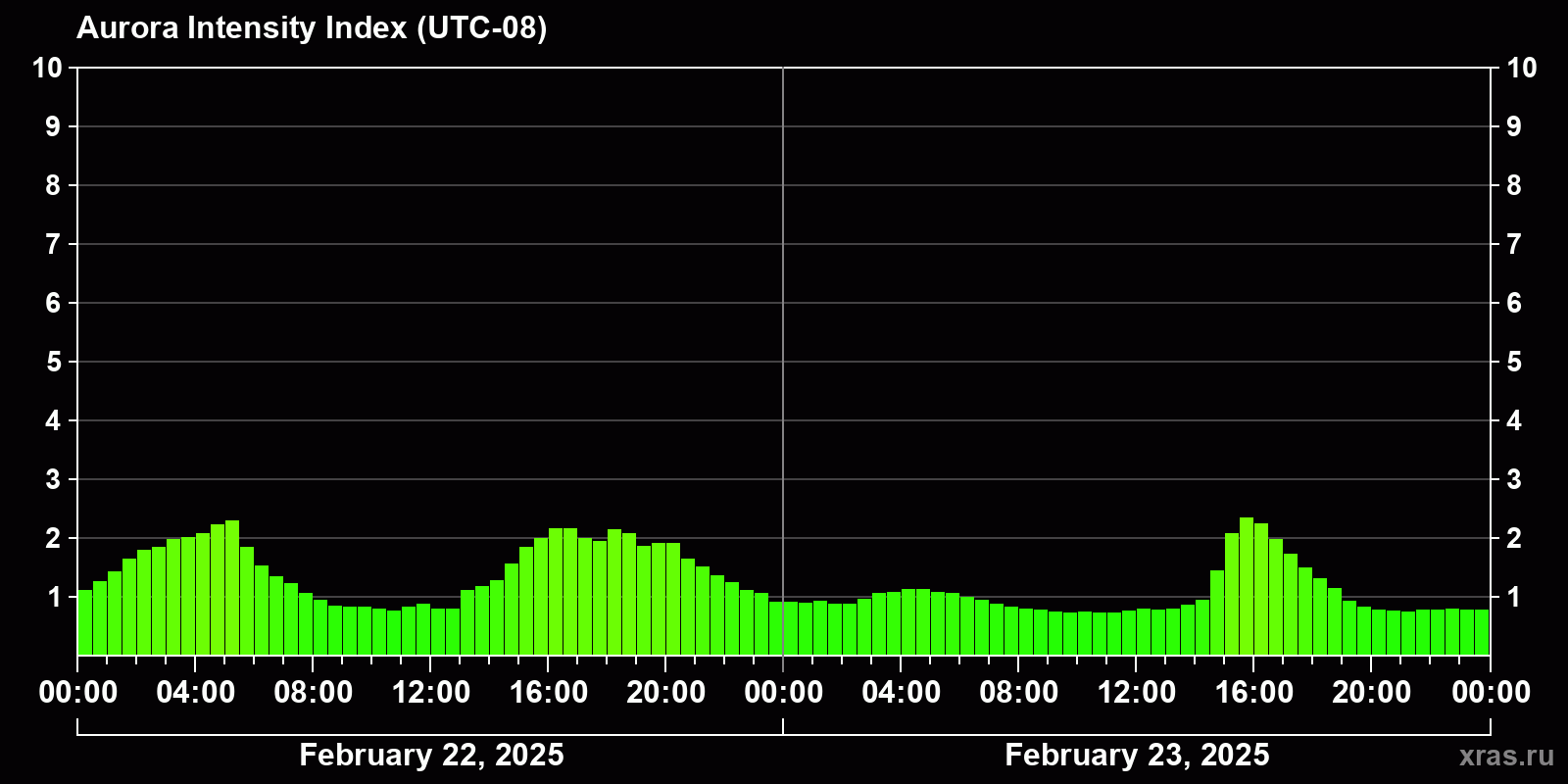 Auroral intensity index and the theoretically possible latitude of observations for nighttime in the Western Hemisphere as of 2025-02-23 23:58 (end of day) local time