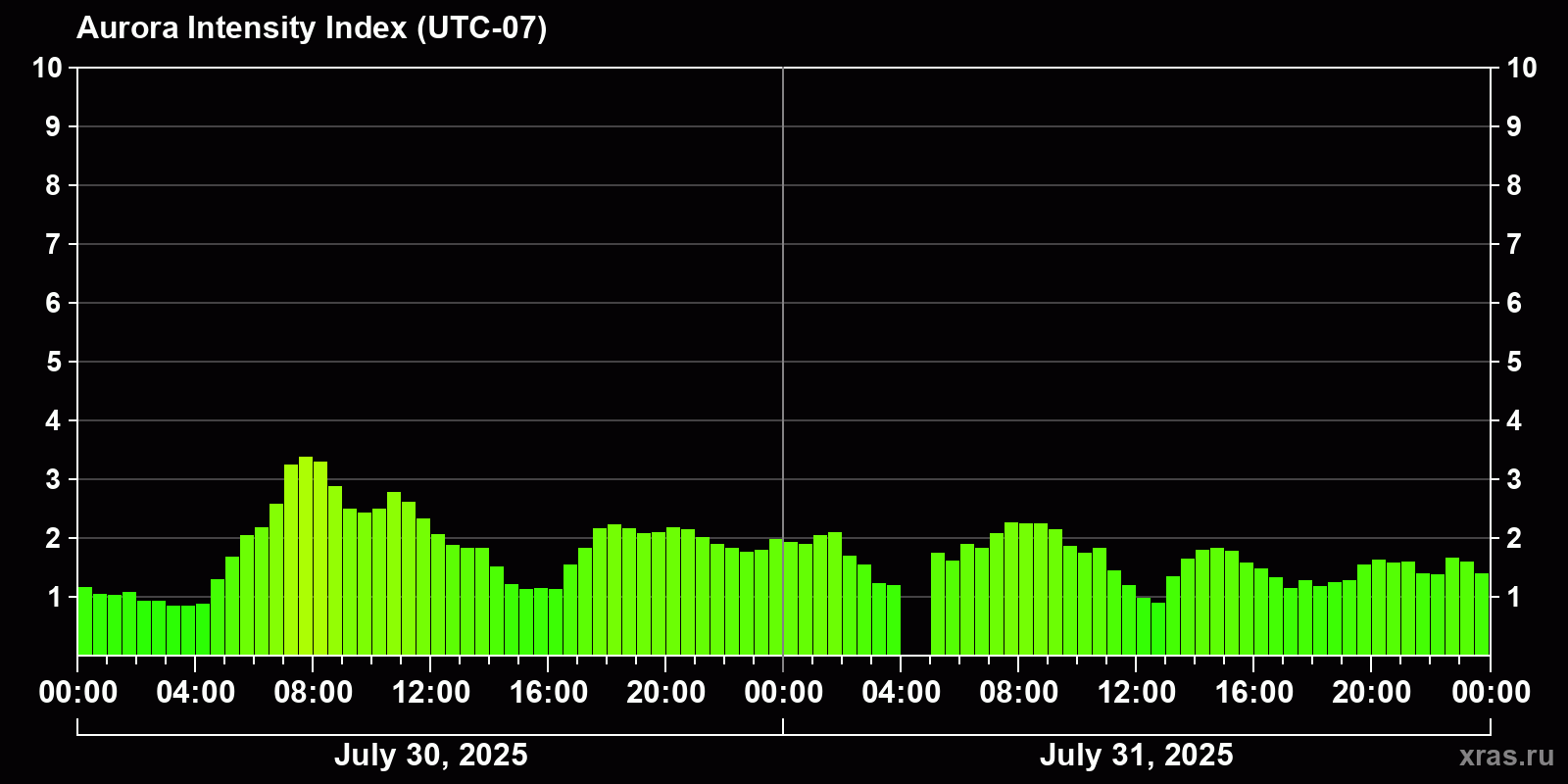 Changes in the auroral intensity index from 2025-07-30 to 2025-07-31 local time