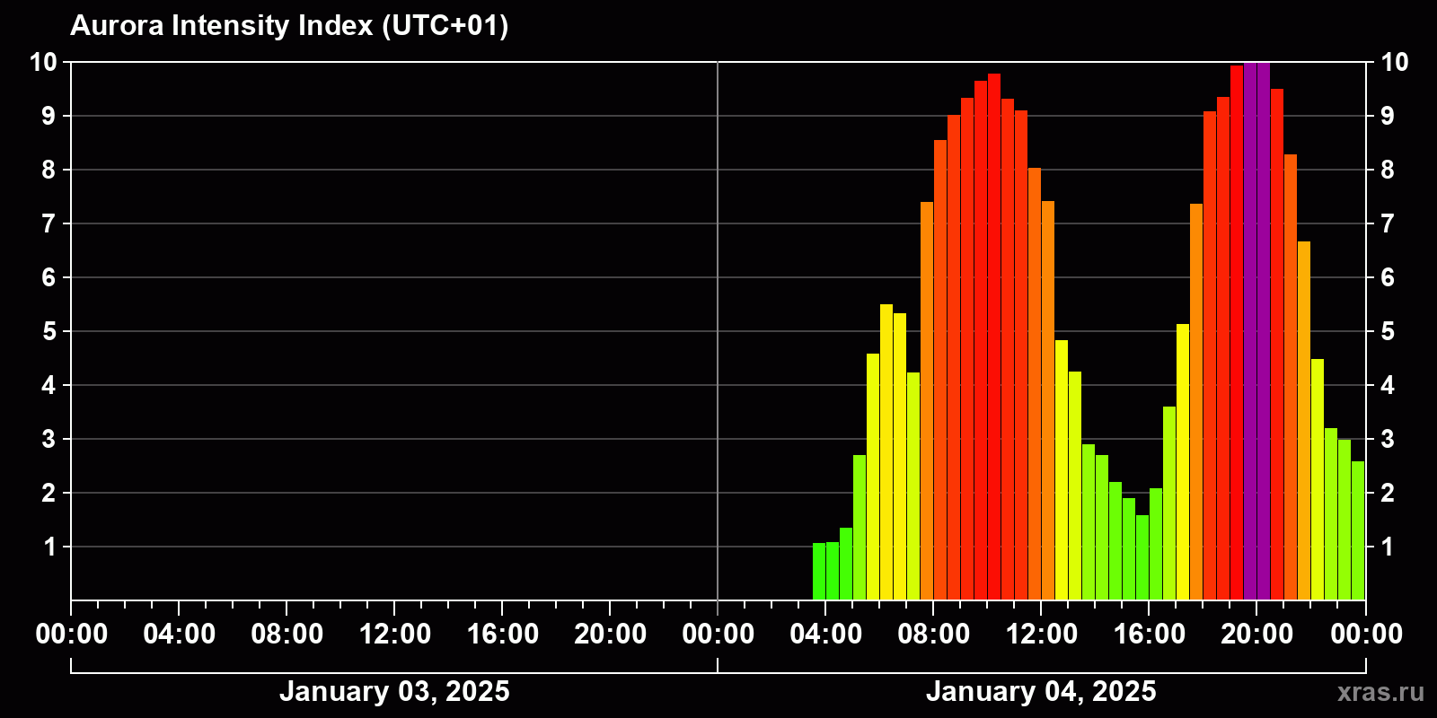 Changes in the auroral intensity index from 2025-01-03 to 2025-01-04 local time