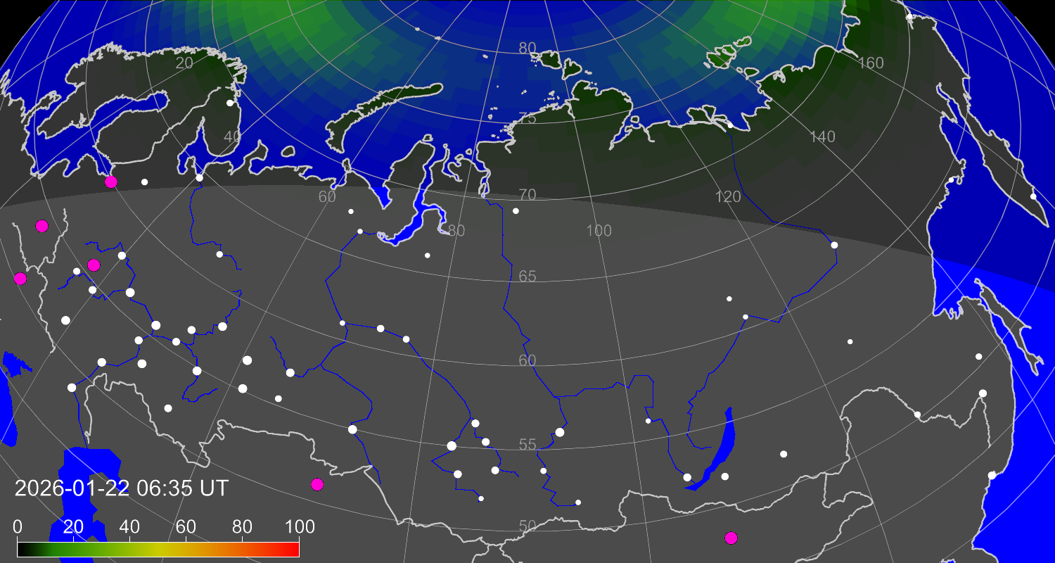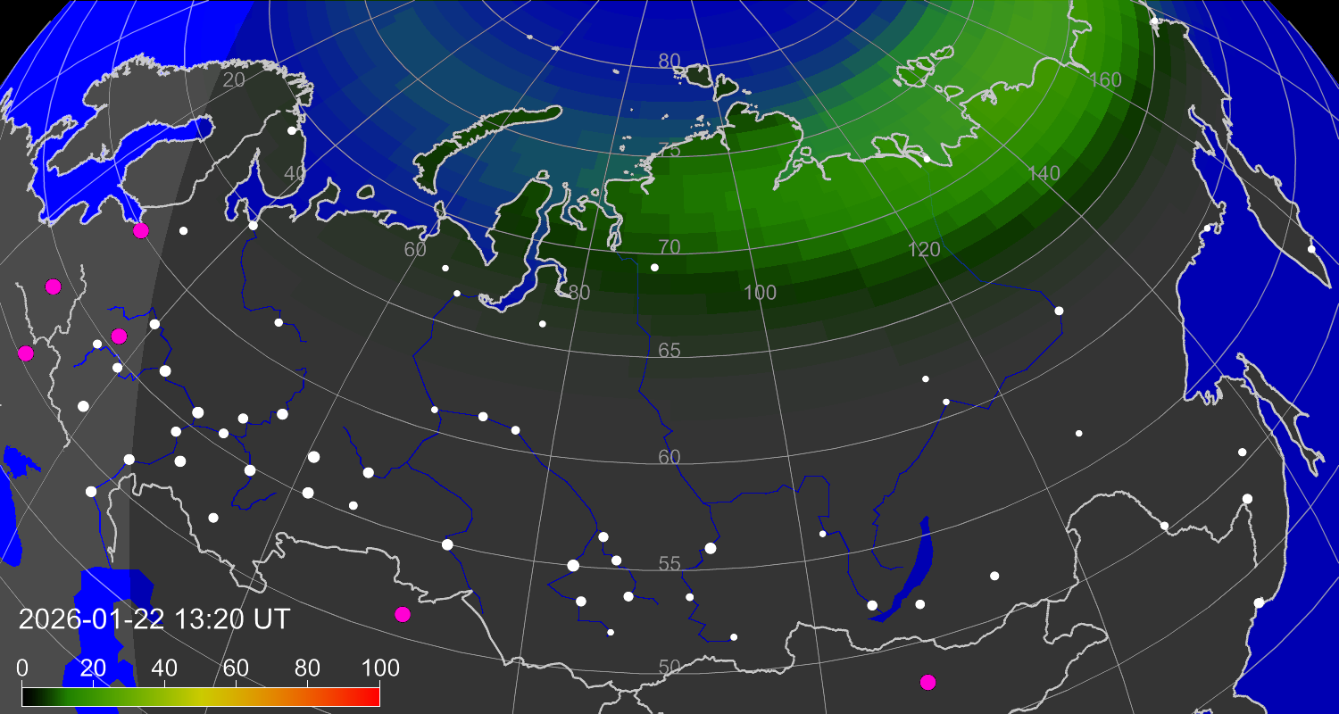 Индекс интенсивности полярных сияний и теоретически возможная широта наблюдений для ночного времени в восточном полушарии