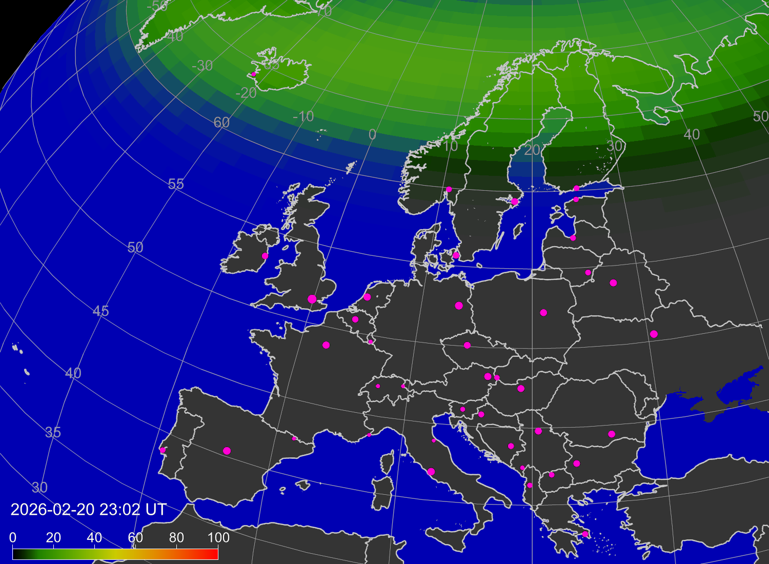 Индекс интенсивности полярных сияний и теоретически возможная широта наблюдений для ночного времени в восточном полушарии