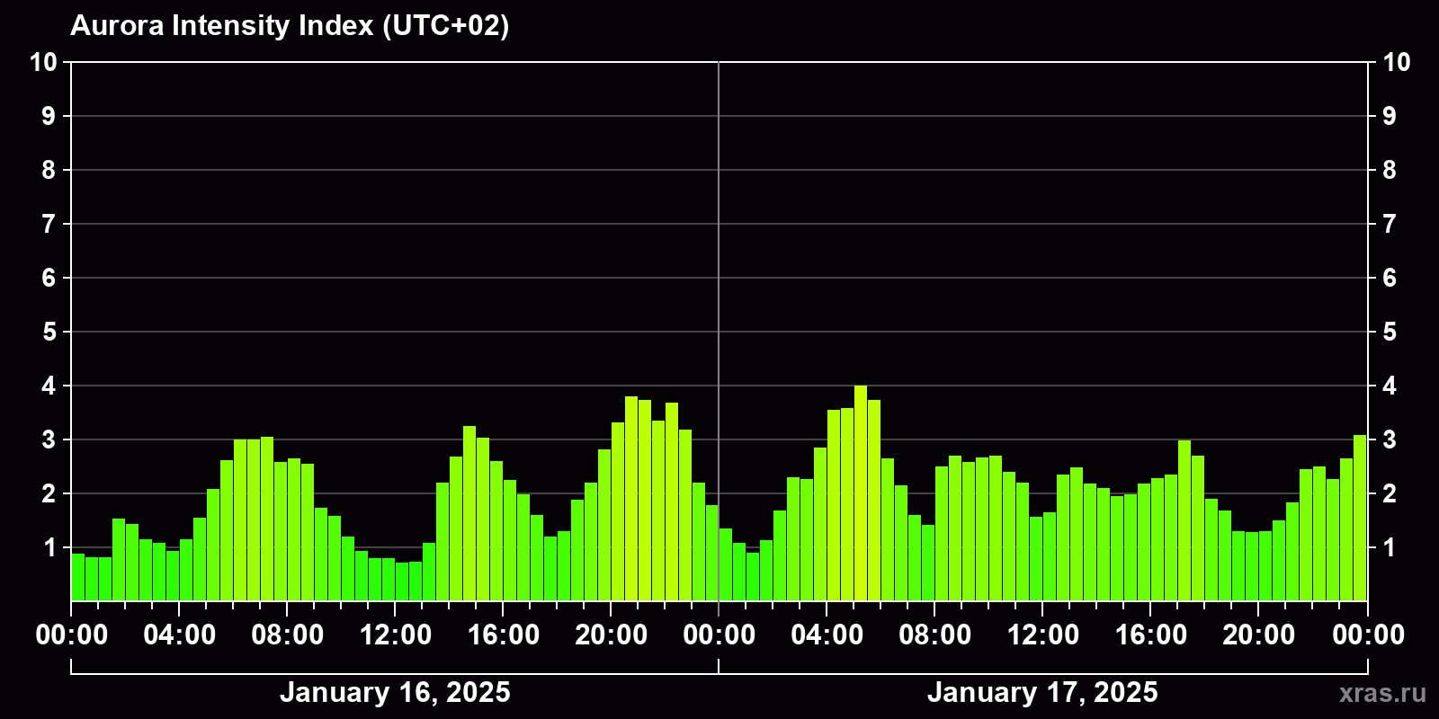 Auroral intensity index and the theoretically possible latitude of observations for nighttime in the Estern Hemisphere as of 2025-01-17 23:48 (end of day) local time