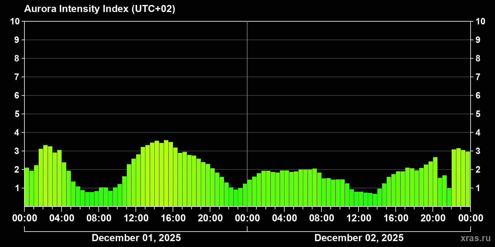 Changes in the auroral intensity index from 2025-12-01 to 2025-12-02 local time