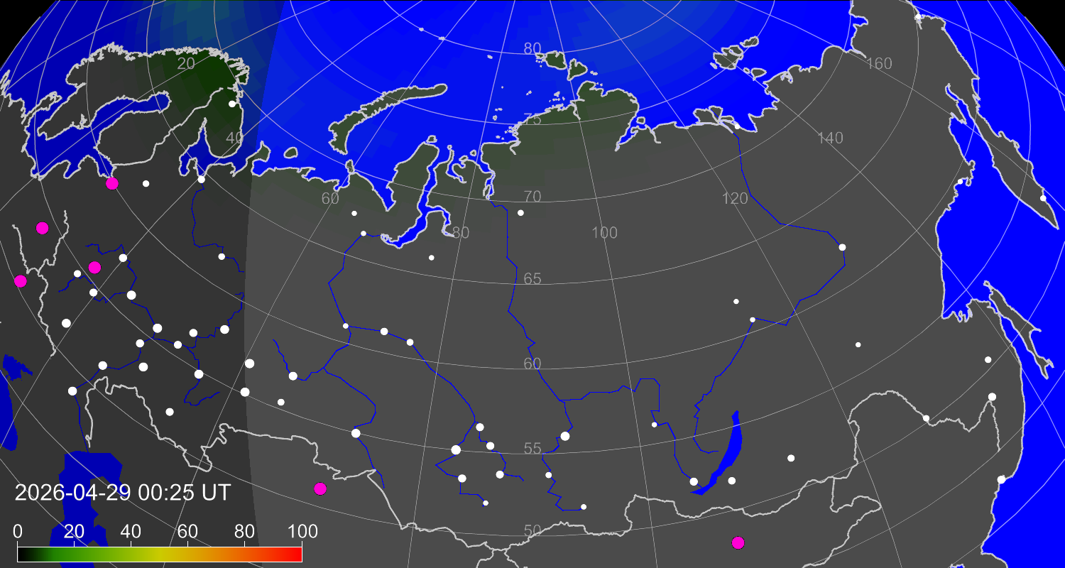 Probability of northern lights (auroras) in cities of Russia
