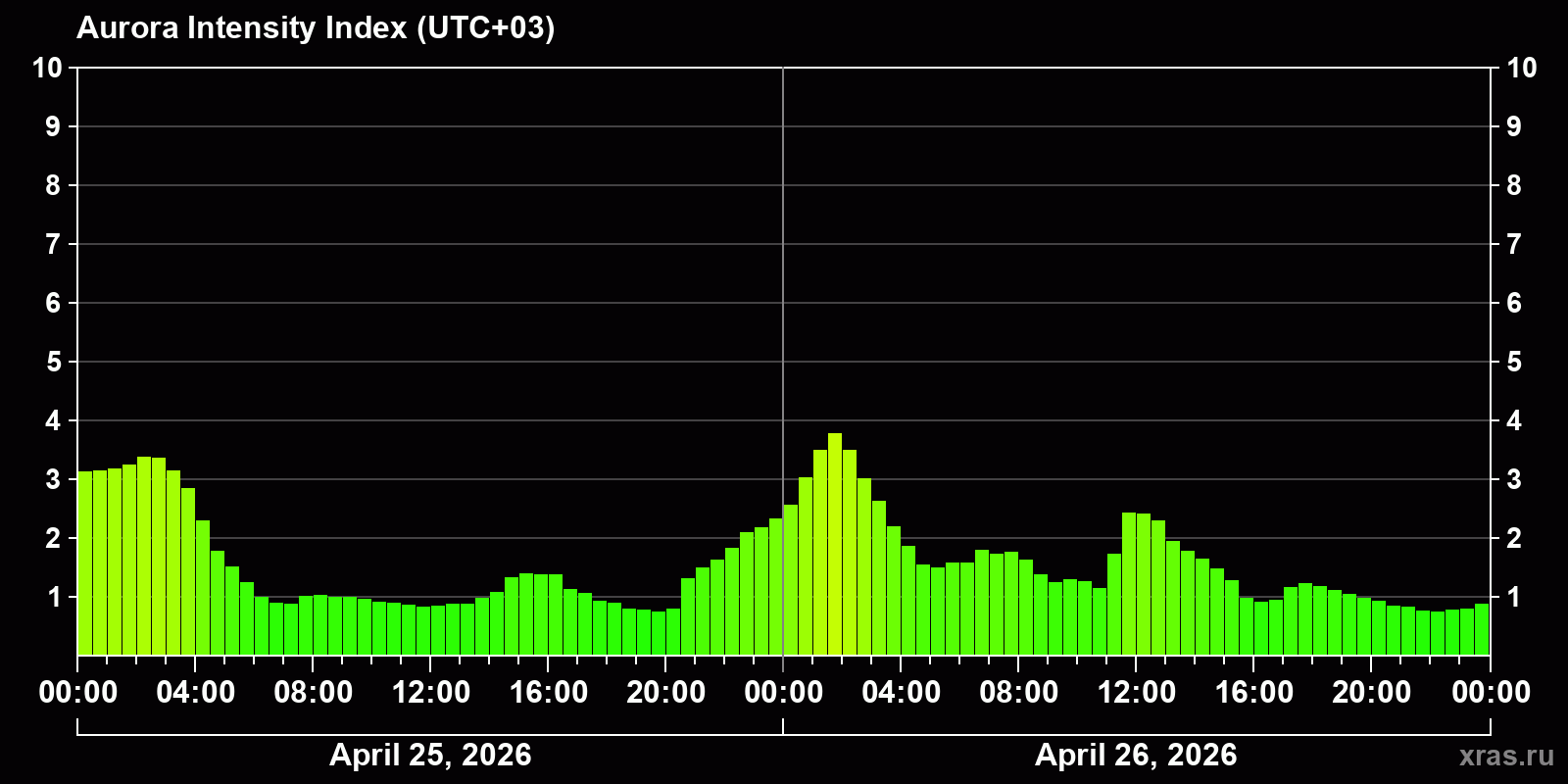 Auroral intensity index and the theoretically possible latitude of observations for nighttime in the Estern Hemisphere as of 2026-04-26 23:55 (end of day) local time