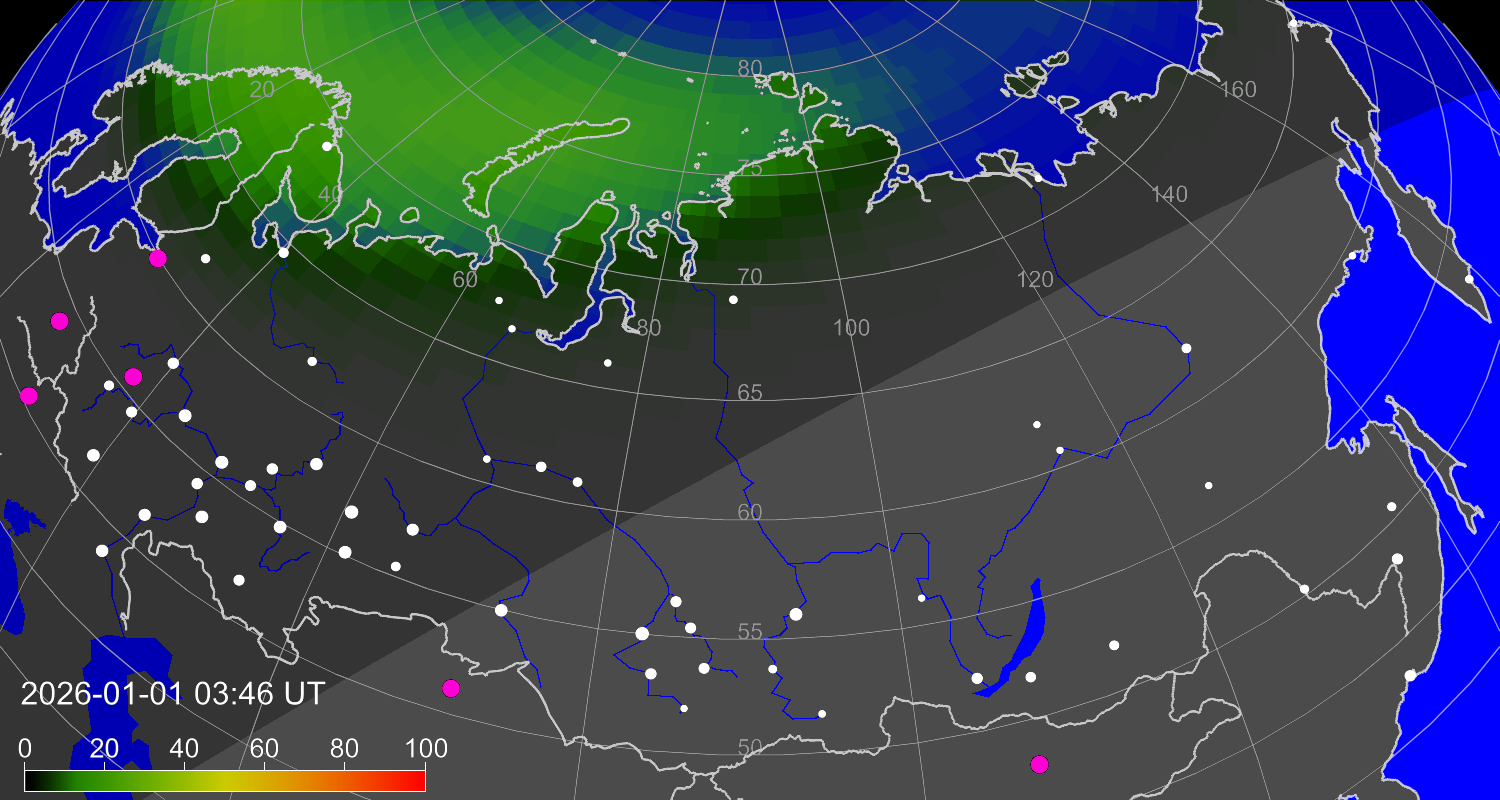 Изменения и часовой прогноз индекса интенсивности полярных сияний с 2026-01-01 по 2026-01-02