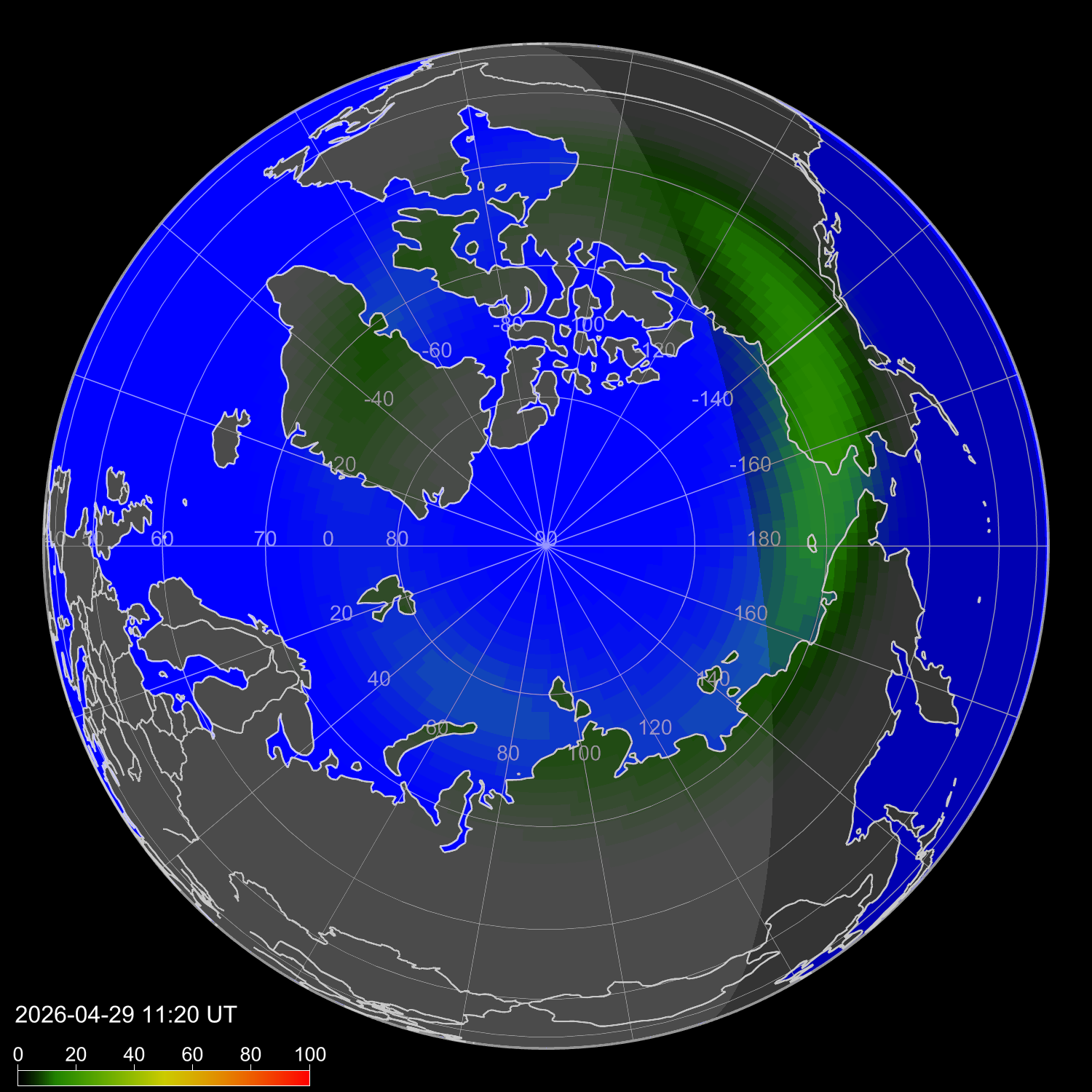 Changes and hourly forecast of the auroral intensity index from 2026-04-28 to 2026-04-29