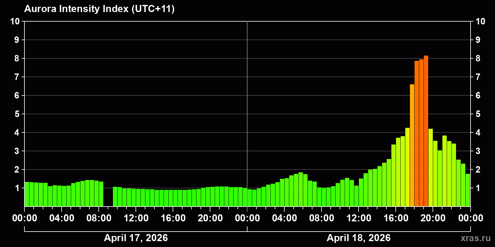 Changes in the auroral intensity index from 2026-04-17 to 2026-04-18 local time