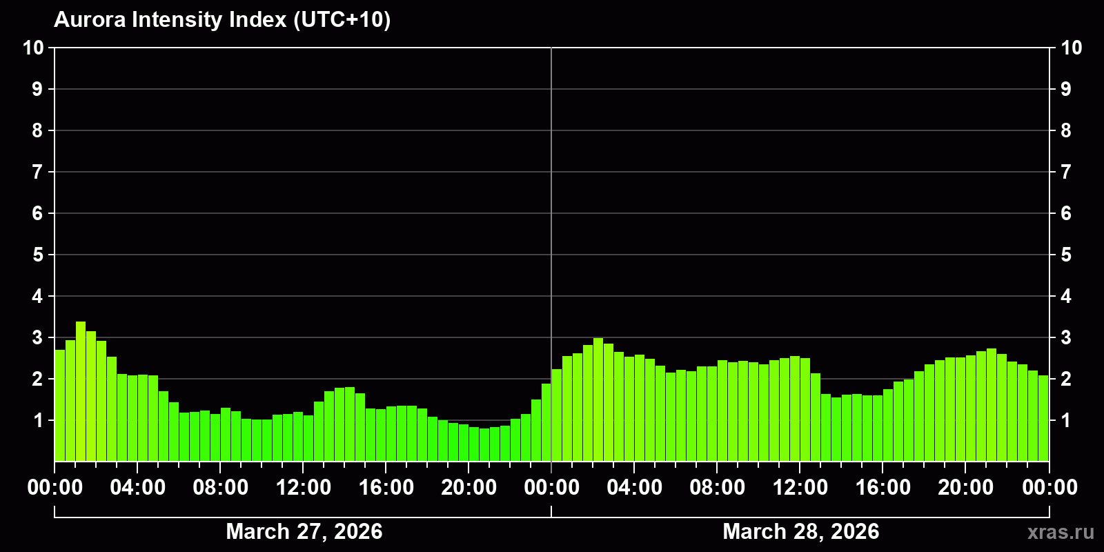 Changes in the auroral intensity index from 2026-03-27 to 2026-03-28 local time