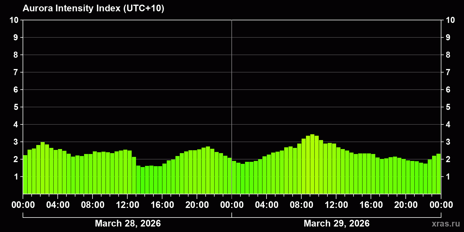Auroral intensity index and the theoretically possible latitude of observations for nighttime in the Estern Hemisphere as of 2026-03-29 23:51 (end of day) local time