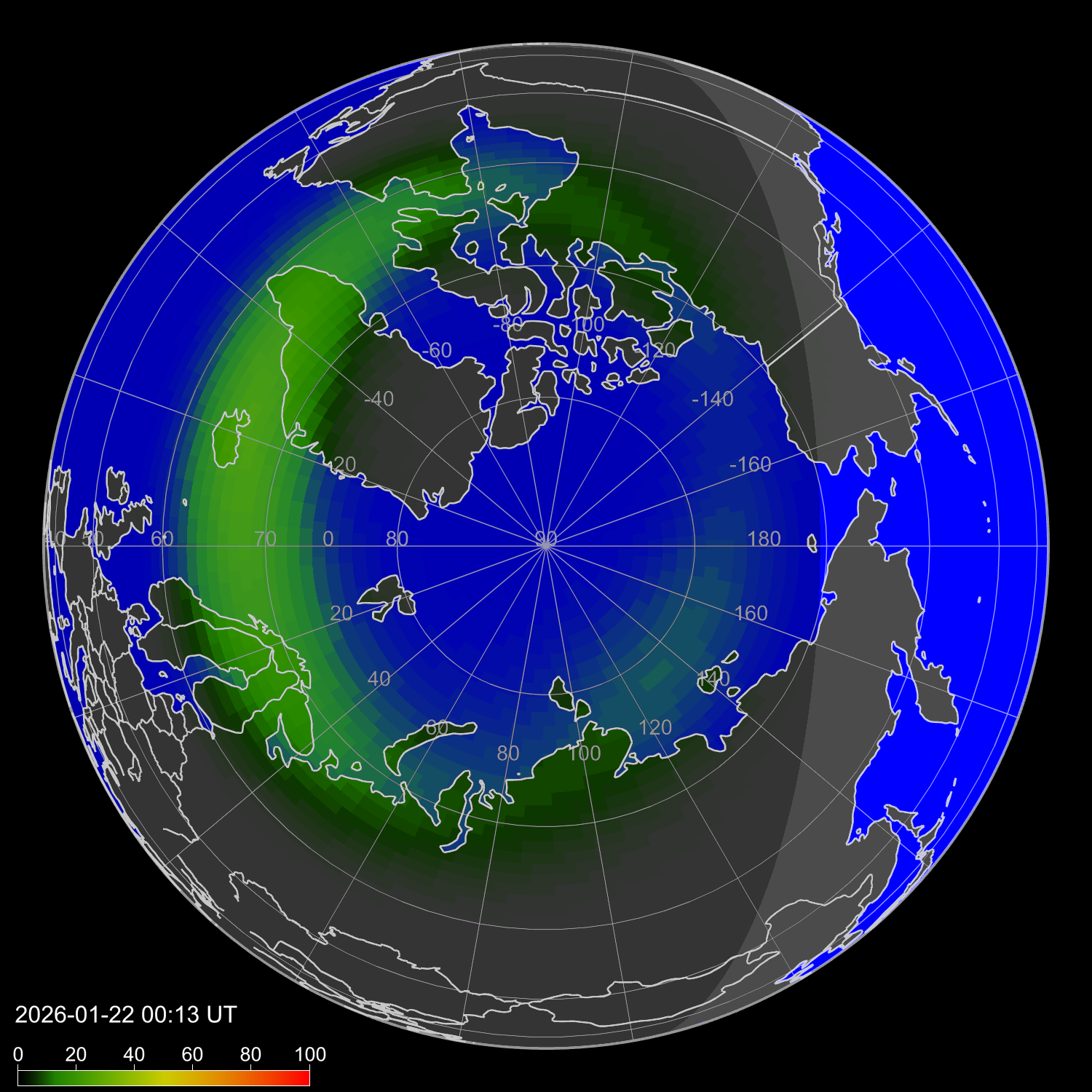Индекс интенсивности полярных сияний и теоретически возможная широта наблюдений для ночного времени в восточном полушарии