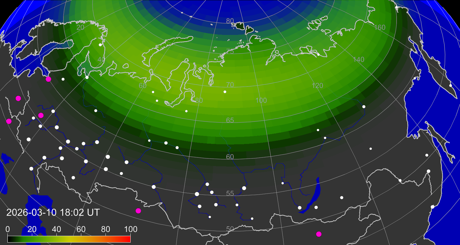 Probability of northern lights (auroras) in cities of Russia