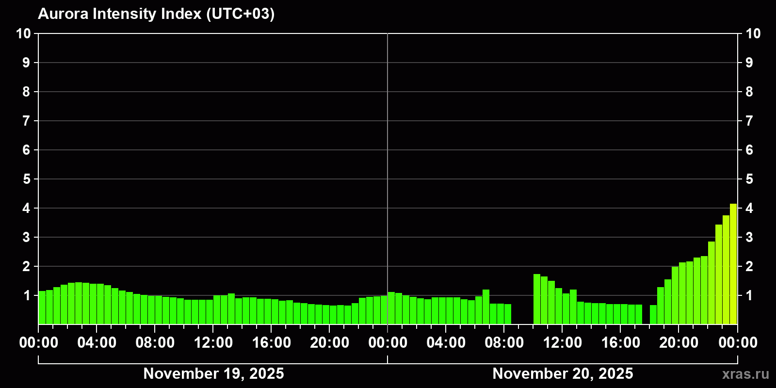 Auroral intensity index and the theoretically possible latitude of observations for nighttime in the Estern Hemisphere as of 2025-11-20 23:55 (end of day) local time