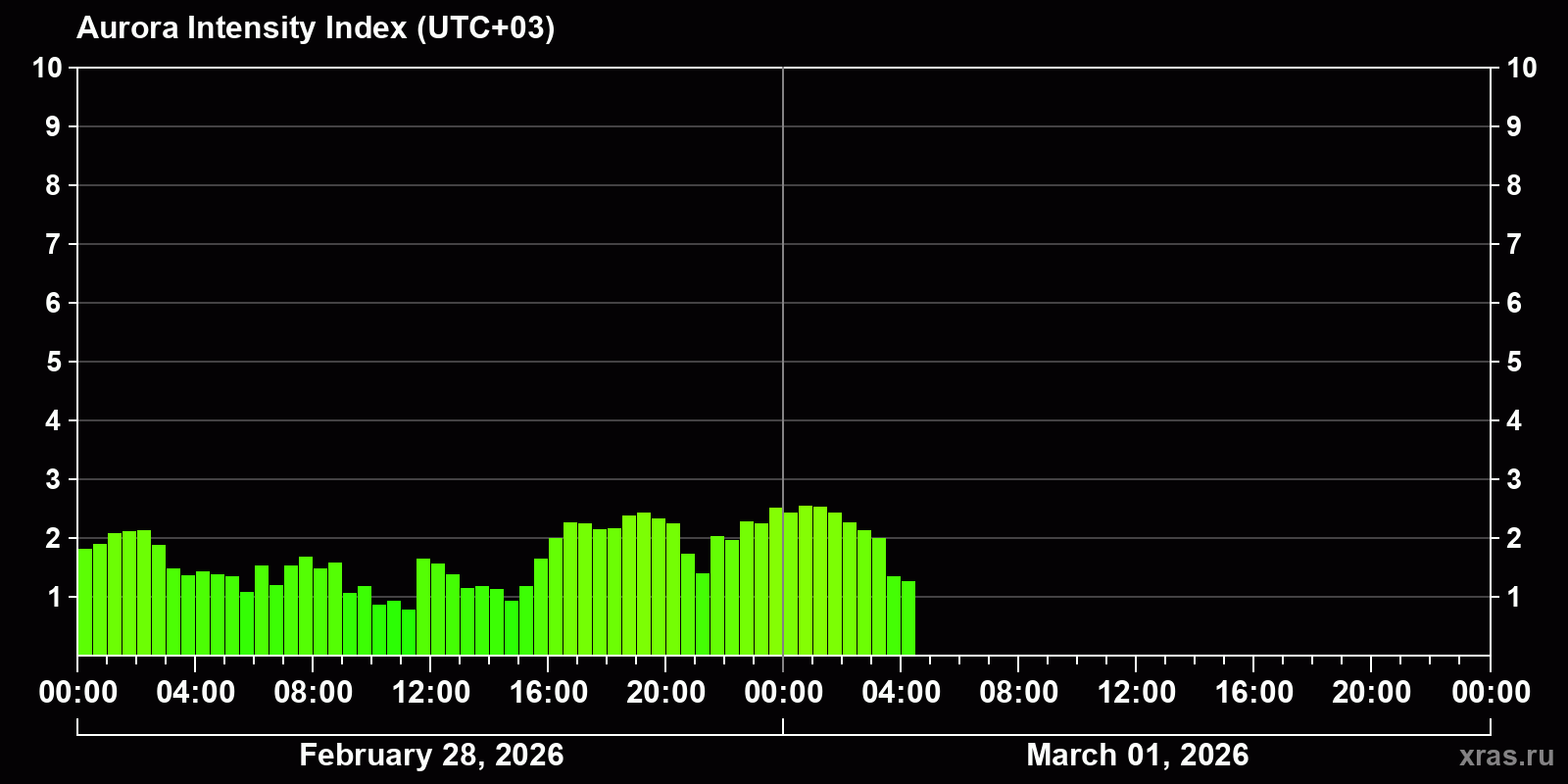 Auroral intensity index and the theoretically possible latitude of observations for nighttime in the Estern Hemisphere as of 2026-03-01 02:32 (end of day) local time