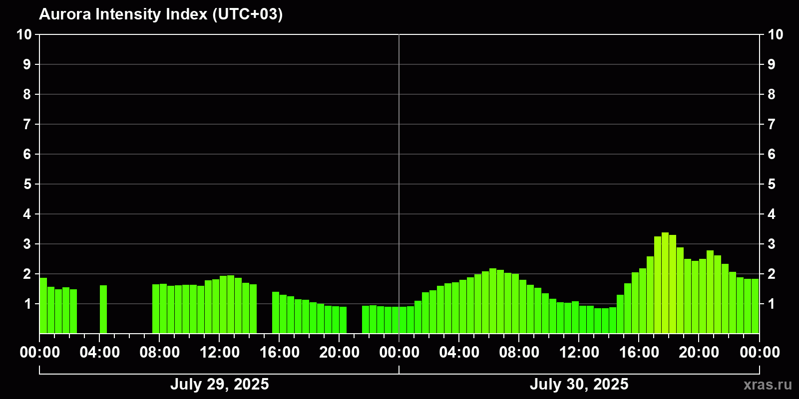 Changes in the auroral intensity index from 2025-07-29 to 2025-07-30 local time