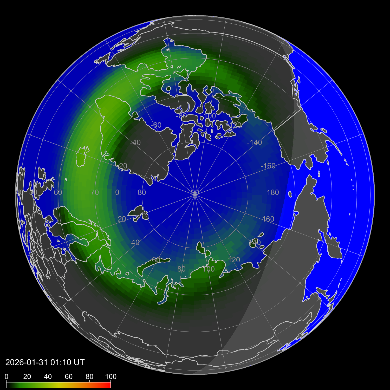 Изменения и часовой прогноз индекса интенсивности полярных сияний с 2026-01-30 по 2026-01-31