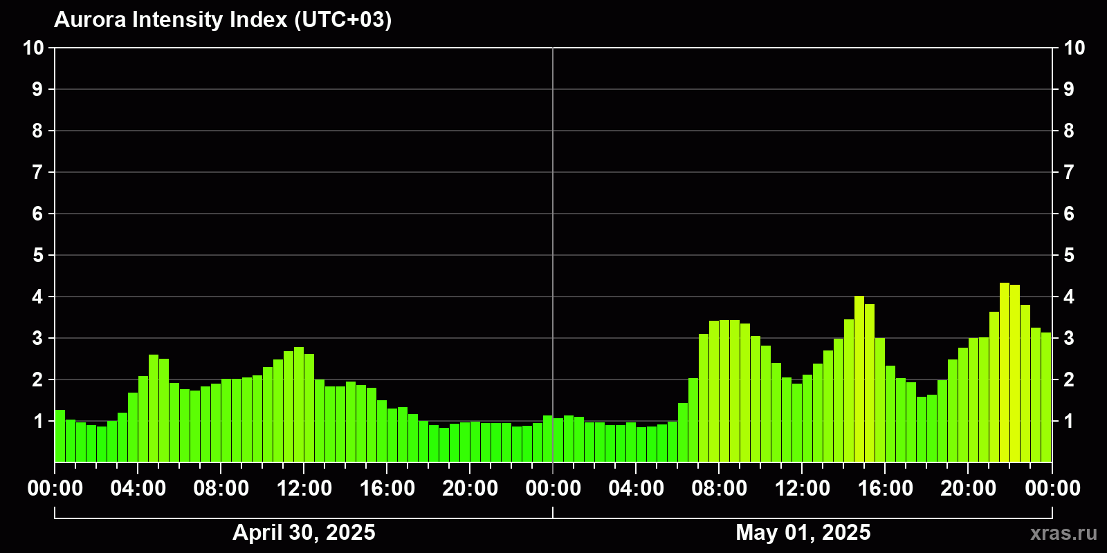 Auroral intensity index and the theoretically possible latitude of observations for nighttime in the Estern Hemisphere as of 2025-05-01 23:57 (end of day) local time