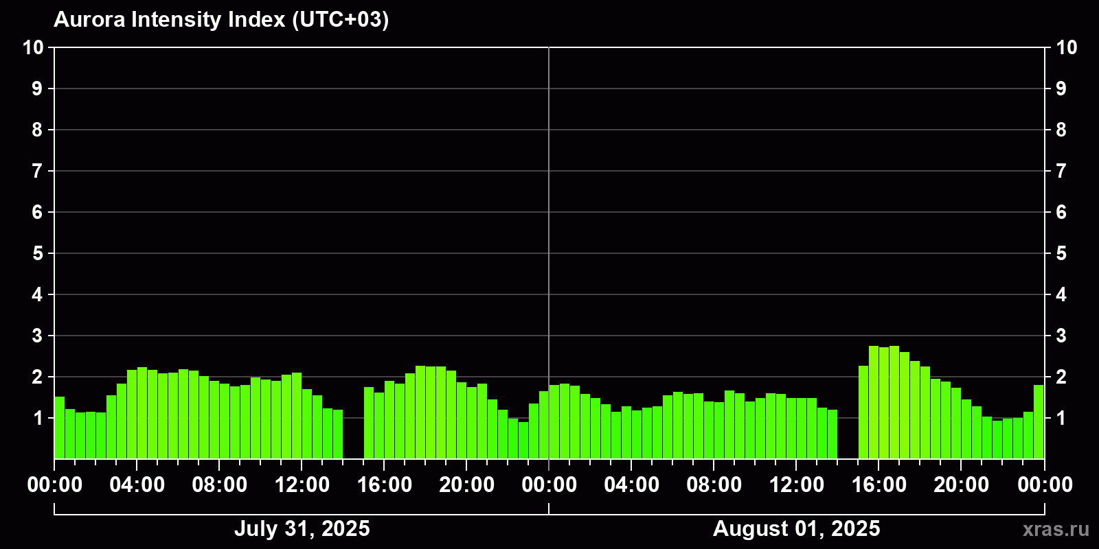 Auroral intensity index and the theoretically possible latitude of observations for nighttime in the Estern Hemisphere as of 2025-08-01 23:51 (end of day) local time