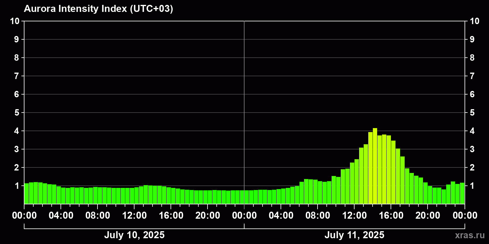 Changes in the auroral intensity index from 2025-07-10 to 2025-07-11 local time
