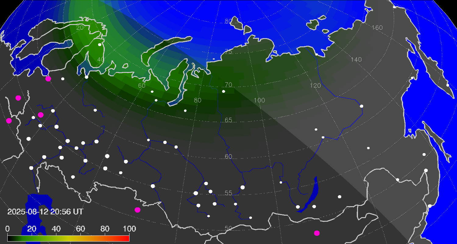 Probability of northern lights (auroras) in cities of Russia