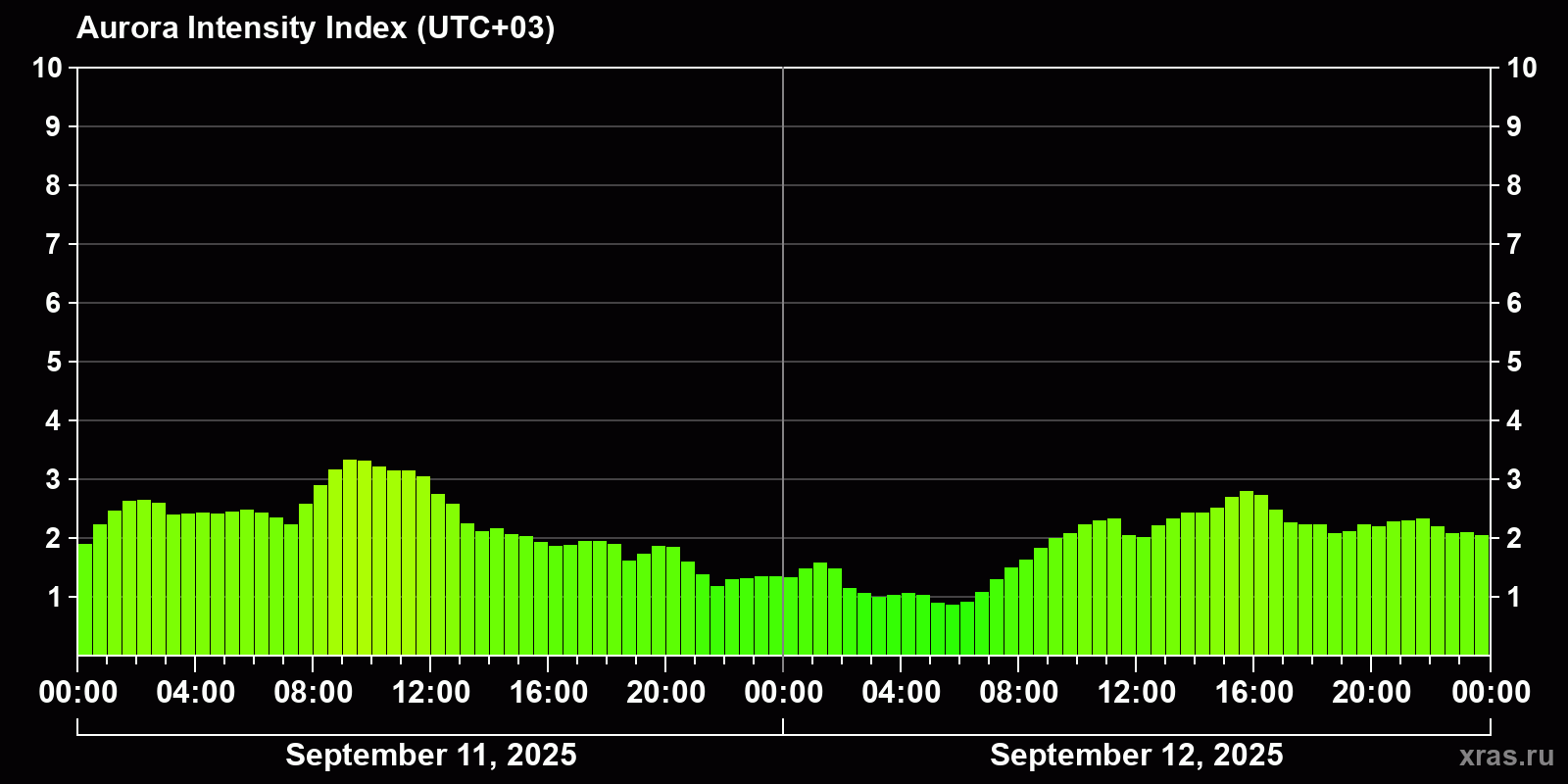 Changes in the auroral intensity index from 2025-09-11 to 2025-09-12 local time