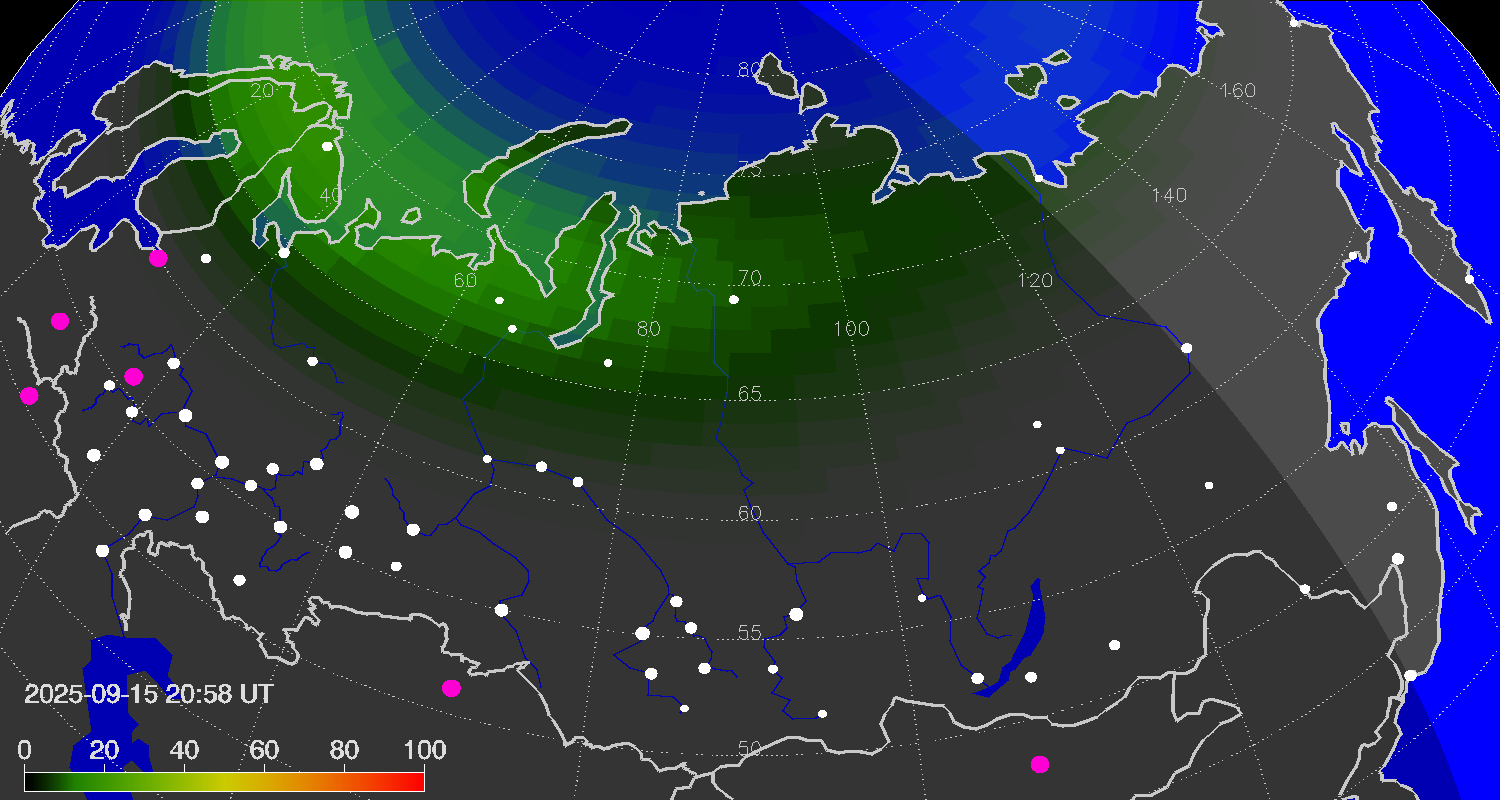 Probability of northern lights (auroras) in cities of Russia