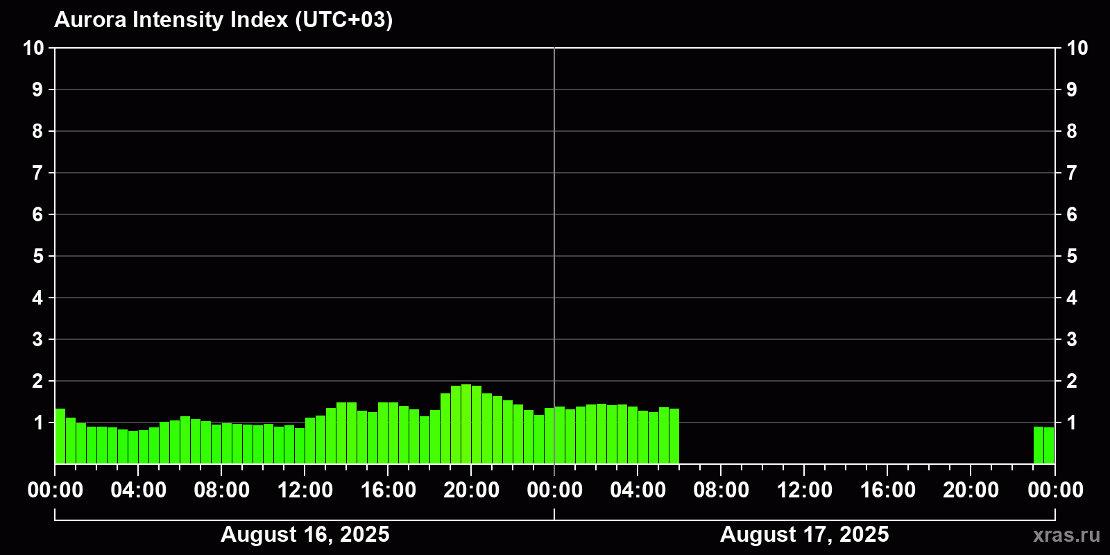 Auroral intensity index and the theoretically possible latitude of observations for nighttime in the Estern Hemisphere as of 2025-08-17 23:54 (end of day) local time