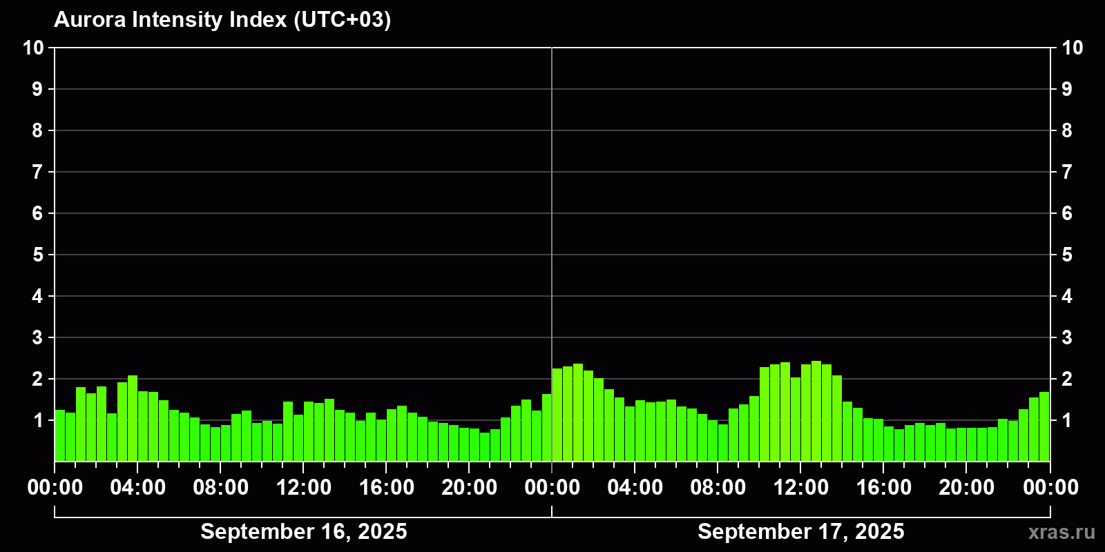 Changes in the auroral intensity index from 2025-09-16 to 2025-09-17 local time